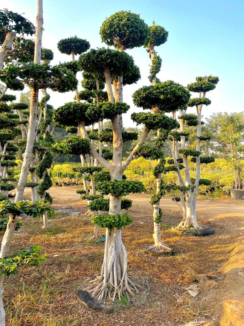 Ficus Topiary and Bonsai plants are known for their strong roots, dense foliage, and long life. These plants are carefully shaped over time, giving them an artistic look while keeping them healthy and natural. The green leaves stay fresh all year, making them a reliable choice for outdoor decoration.